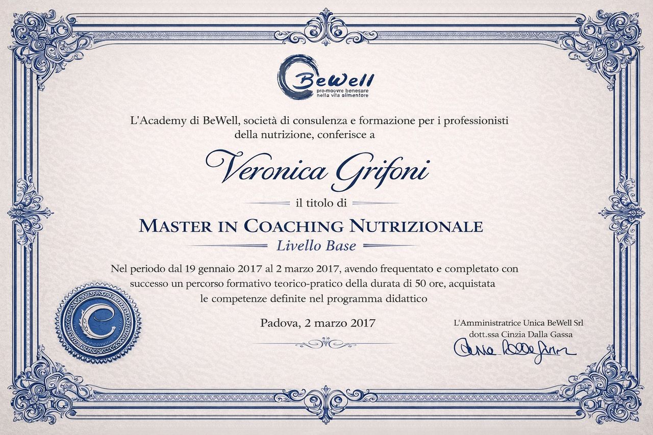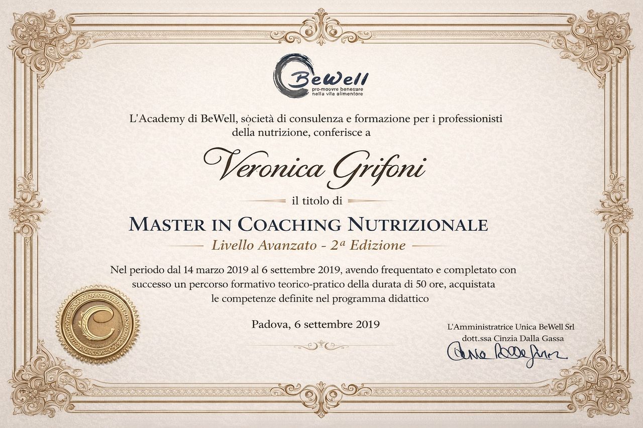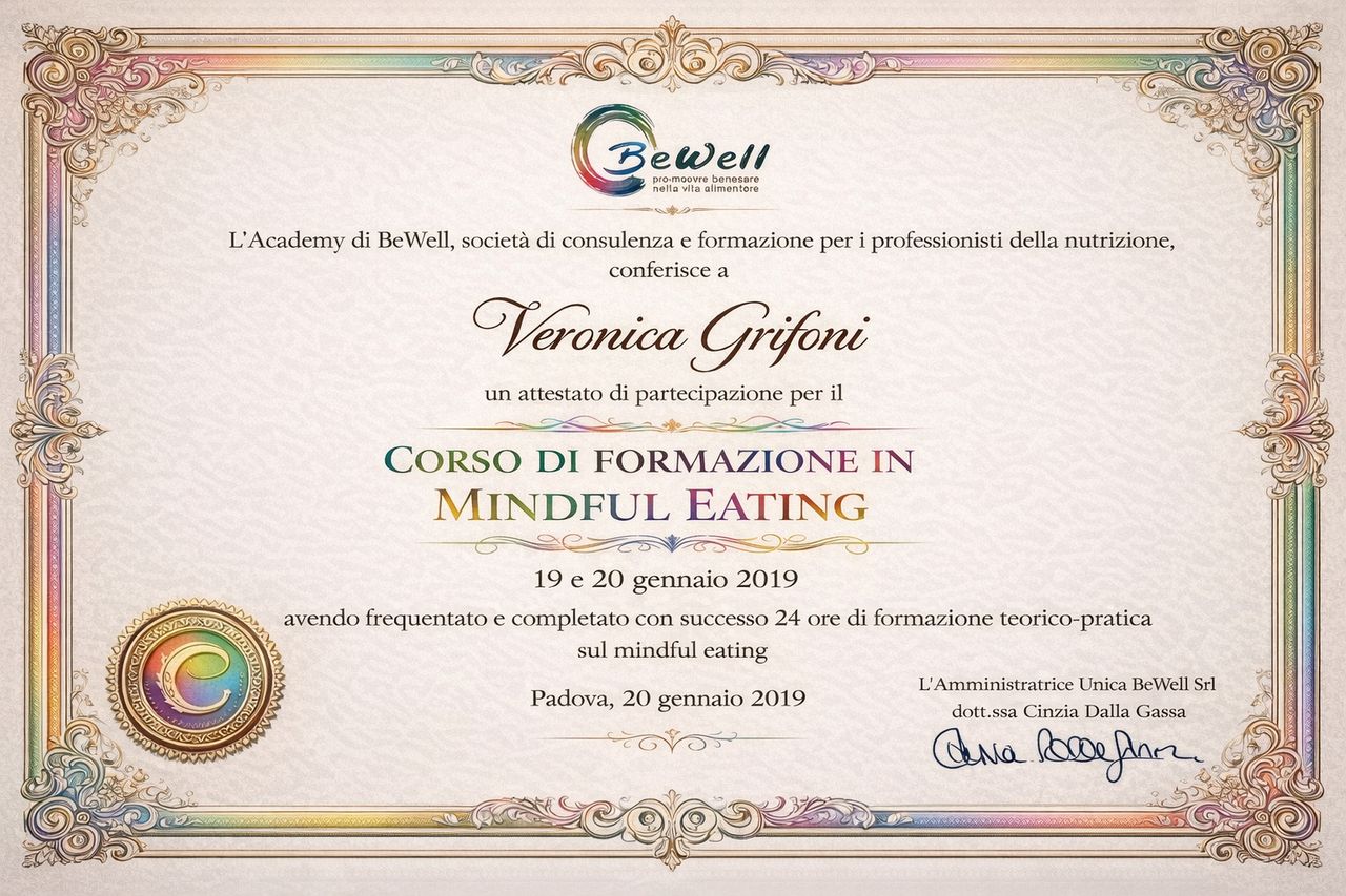 Per questo negli anni ho scelto di investire costantemente nella mia crescita personale e professionale, affiancando alla formazione tecnico-scientifica percorsi come il Coaching Nutrizionale, l’Empowerment Professionale e la Mindful Eating. Questi strumenti mi permettono di accompagnare chi si rivolge a me in modo consapevole e personalizzato.